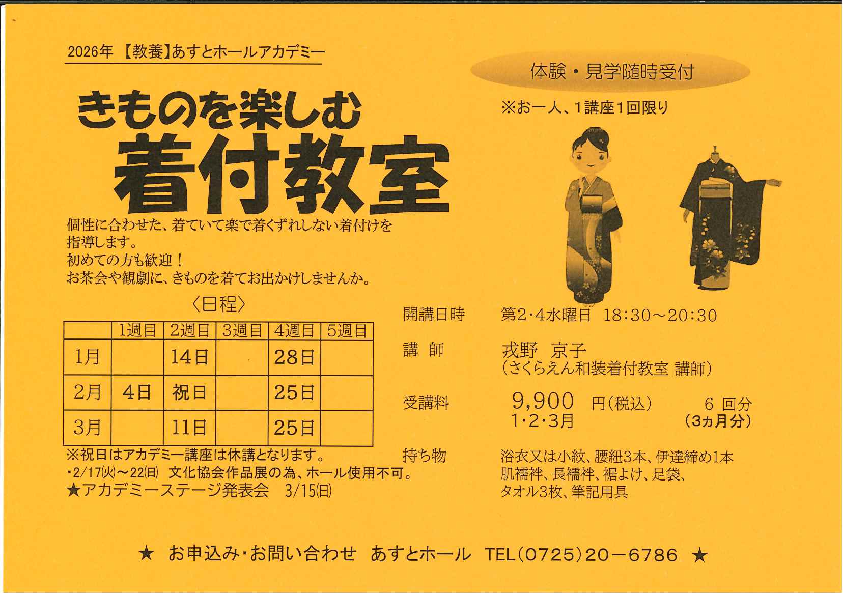 浴衣又は小紋、腰紐3本、だて締め1本、肌襦袢、長襦袢、裾よけ、足袋、タオル3枚、筆記用具