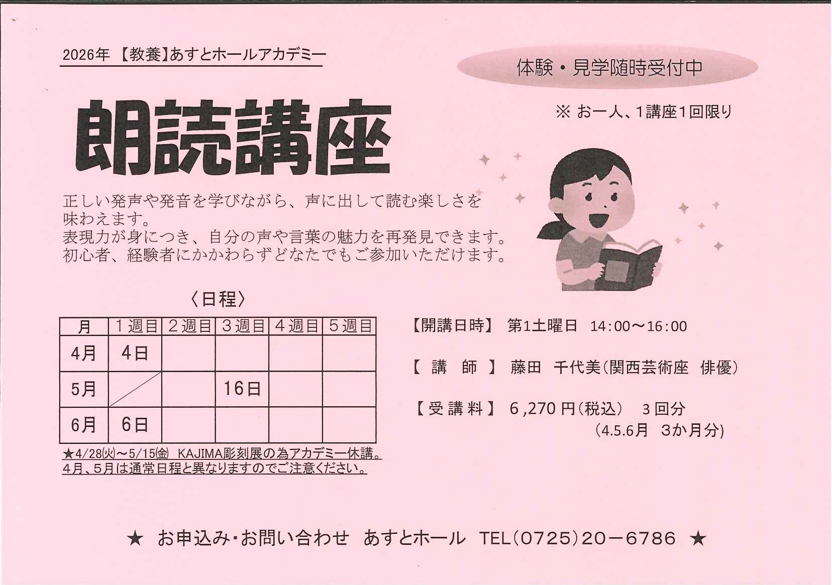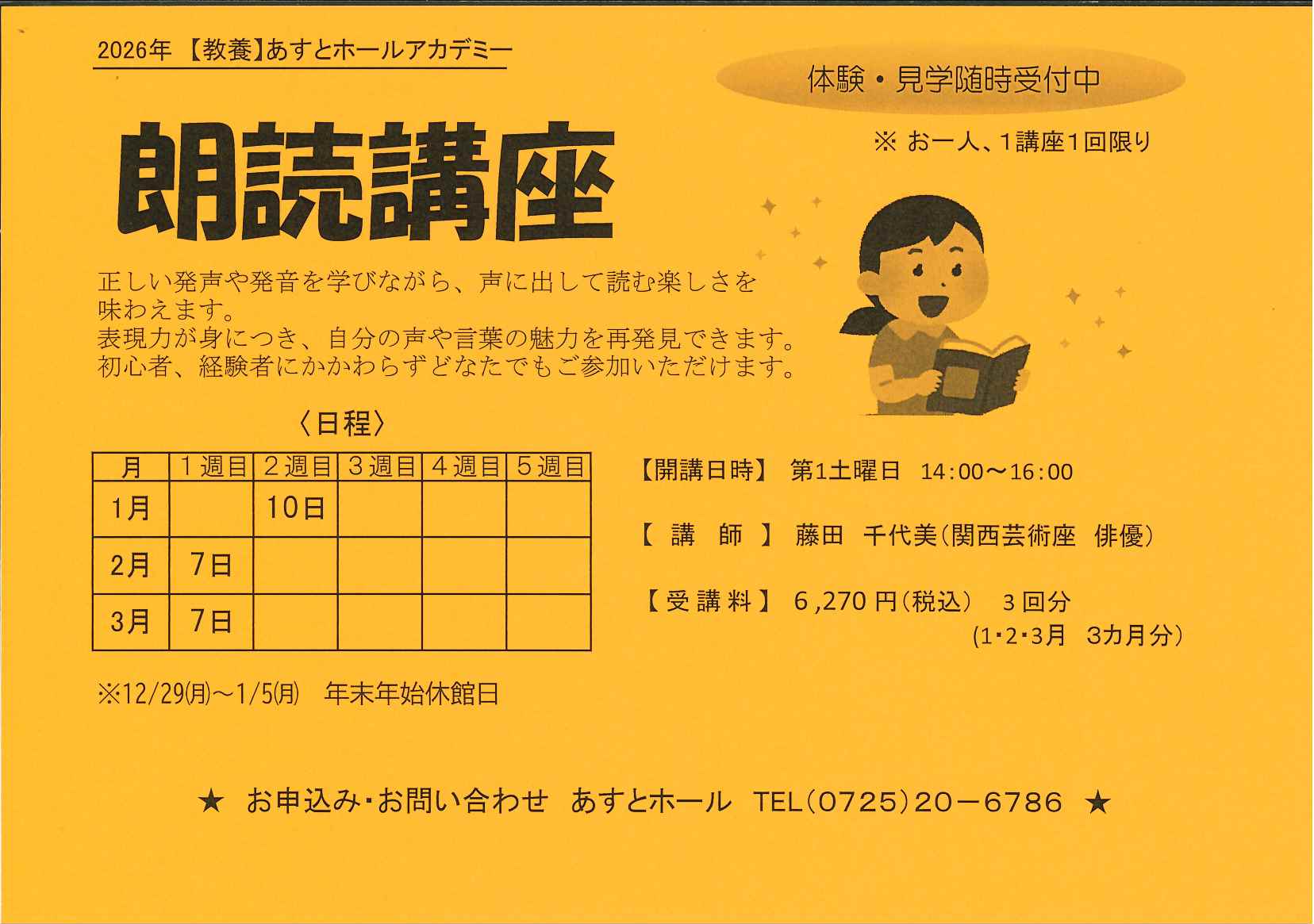 ホーム アカデミー講座 朗読講座 朗読講座 講座 正しい発声や発音を学びながら、声に出して読む楽しさを味わえます。 募集 募集中 開講日 第1土曜日 14:00-16:00 講師名 藤田千代美(関西芸術座 俳優) 定員 15名 受講料 6,270円(3回) (1回:2,090円) 持ち物 筆記具 日程 別ウインドウで開きます。 一覧へ戻る