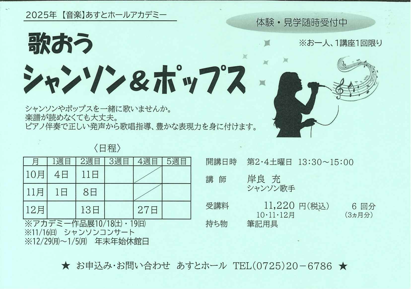 ホーム アカデミー講座 歌おうシャンソン&ポップス 歌おうシャンソン&ポップス 講座 あなたの人生・愛をうたいませんか。 楽譜が読めなくても大丈夫!ピアノ伴奏で、発声・歌唱指導いたします。 マイクを使用して楽しく歌います。 ※授業はグループレッスンとなります。 募集 募集中 開講日 第2・4土曜日 13:30-15:00 講師名 岸良充(シャンソン歌手) 受講料 11,220円(6回) (1回:1,870円) 持ち物 筆記用具など 日程 別ウインドウで開きます。 一覧へ戻る