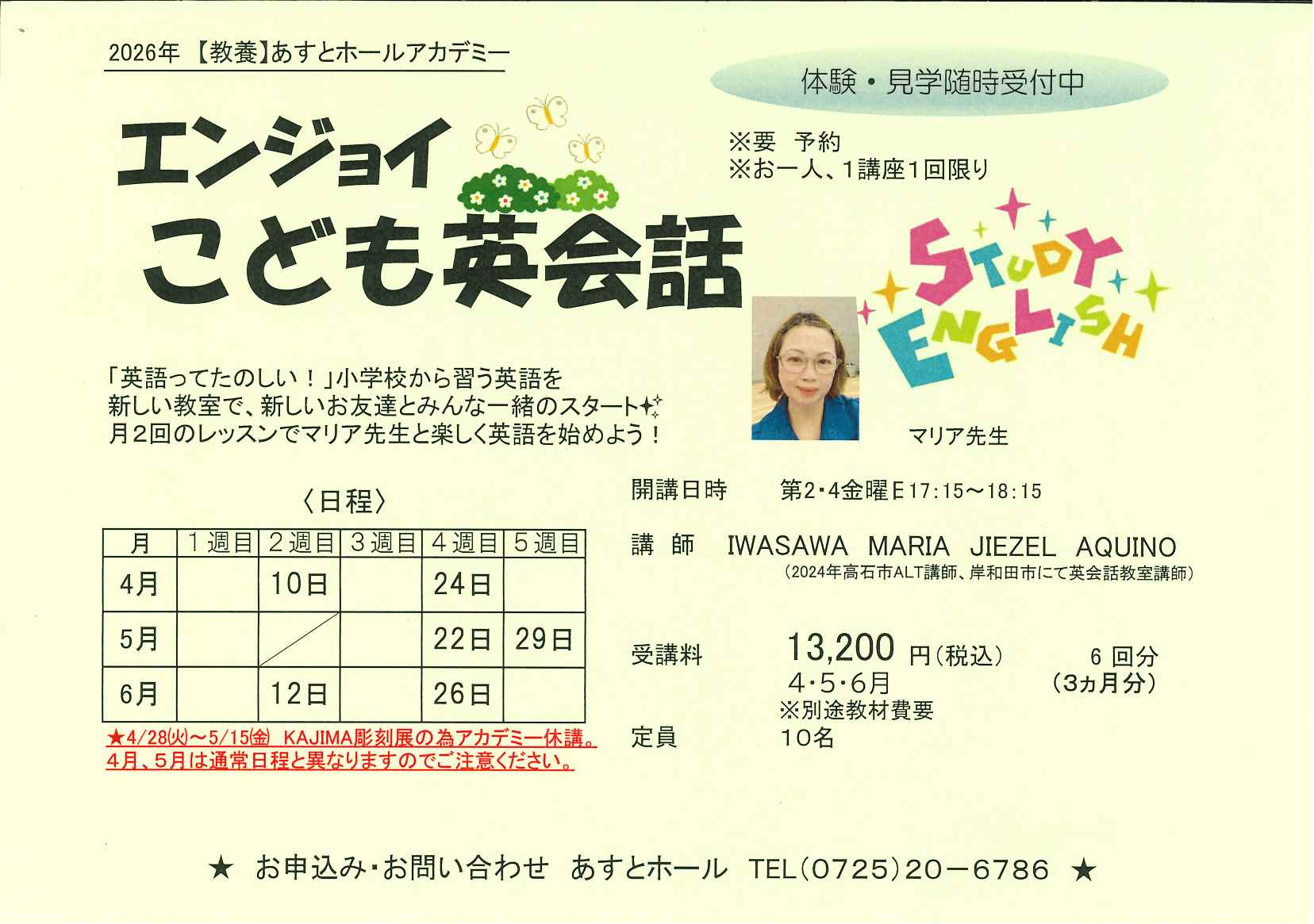 月2回のレッスンでマリア先生と楽しく英語を始めよう!